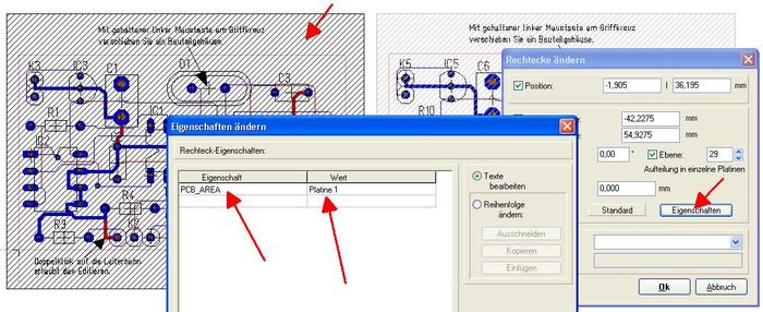 Sowohl bei der Ausgabe der Gerberdaten... | Jetzt kommd das Wichtige: Rechteck doppelklicken, [Eigenschaften] drücken und der Platine unter der Eigenschaft "PCB_AREA" einen Namen geben und eintragen. Sowohl bei der Ausgabe der Gerberdaten... | ||