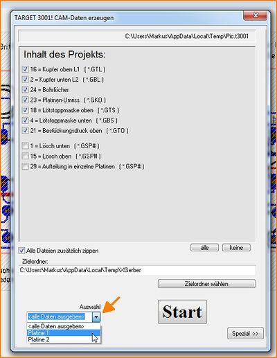 ...als auch bei der Ausgabe der Stückliste kann eine bestimmte Platine anhand ihres Namens ausgewählt werden: