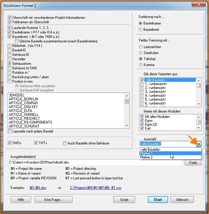 ...als auch bei der Ausgabe der Stückliste kann nun eine bestimmte Platine anhand ihres Namens gewählt werden: