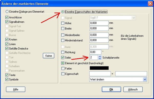 Wenn Sie z.B. ihre Schaltung wegen Platzproblemen auf zwei Seiten aufteilen müssen, benutzen Sie möglichst nicht die Zwischenablage (Ausschneiden - Einfügen). Viel einfacher ist es, die gewünschten Schaltungsteile zu markieren und dann mit der Taste [ä] wie ändern einfach auf die andere Seite fallen zu lassen:
