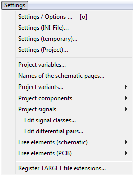 [[Image:MenuSettings.png|left]]<br>[[Settings / Options]]<br>[[Settings_/_Options#Settings_.28Registry.29|Settings (Registry)]]<br>[[Settings_/_Options#Settings__.28temporarily.29|Settings (temporarily)]]<br>[[Settings_/_Options#Settings_.28Project.29|Settings (Project)]]<br><br>[[Project variables]]<br>[[Page|Schematic pages]]<br>[[Variants|Project variants]]<br>[[Project components]]<br>[[Project signals]]<br>[[Signal classes|Edit signal classes]]<br>[[Differential pairs|Edit differential pairs]]<br>[[Free elements (schematic)]]<br>[[Free elements (PCB)]]<br>[[Register TARGET file extensions]]<br>
