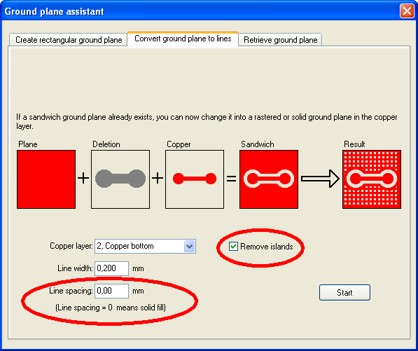 Those ground plane islands can have the electrical effect of a capacitor and might cause unwanted effects in respect to electromagnetic compatibility. In the layout those fragments thus should be removed (Rubout). In TARGET 3001! again start the ground plane assistant (Menu "Actions/Ground planes/Generate ground plane) and within the dialog tick the tab: "Convert ground plane into lines".
