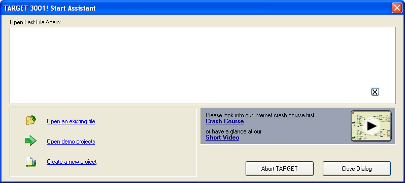 Starting TARGET 3001! you will first see the Start assistant from which you start a new project or load an existing one.