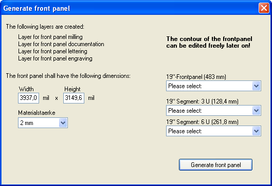 Within the "Determine size of front panel" dialog you can set the outer dimensions of the front panel and the thickness of the material. There are also, on the right, predefined options for 19" front panels and fractions of it. You will find a preset of 100 mm (3,937.01 mil) width and a height of 80 mm (3,149.61 mil. Individual measurements can be set, the maximum dimensions (W x H)are 460 mm x 300 mm. (18,11 x 11.81 inch) The default thickness of the material is 2 mm. However you can also select 1.5mm, 2.0mm, 2.5mm, 3mm and 4mm (or the equivalent in inches).