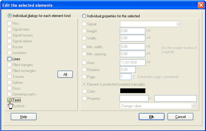 Tick the box "Text" and say OK. Now select from the various options within the "Change Texts" dialog: