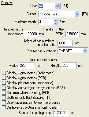 Usable monitor size: Please enter here the measurements of your visible screen. TARGET 3001! calculates the screen display that way that 10cm PCB get 10cm on screen. Use your ruler and measure the inner area of your screen and enter the data to this field.