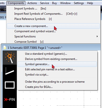 Image: How to open the symbol generator. Prior to the opening of the symbol generator you need to have a component package chosen. If you select "Create_a_new_component#Package_for_layout_use" in Menu Components, please follow the steps to get a package (=footprint pattern) first .