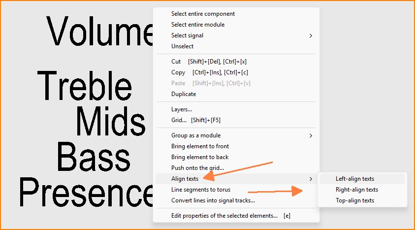 When aligning to the left, the text that starts furthest to the left is used as a reference. When aligning to the right, the text that ends furthest to the right is used as a reference. If you want to align to the top, the text located furthest at the top is used as a reference. When aligning to the left or right, TARGET will then ask whether the texts should be distributed evenly vertically.
