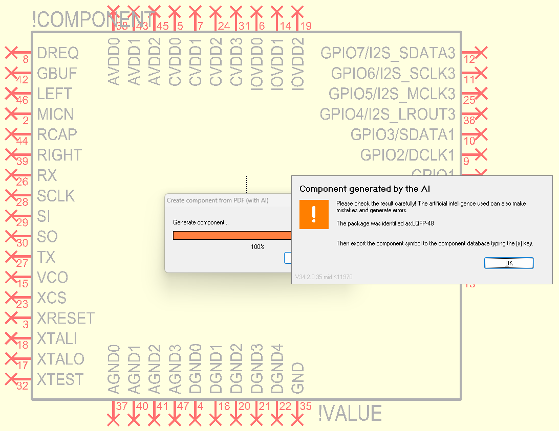 You’ll also need to select the component type (here, “Other Audio” for an audio codec), enter the name (here, “VS1053b”), select the manufacturer (here, “VLSI”), and choose the correct package “LQFP48” (the AI had added a hyphen to “LQFP-48”), copy a function from the PDF if necessary, and finally select the prefix “IC.” Clicking the [Save Component] button completes the process, and the IC is ready for use.
