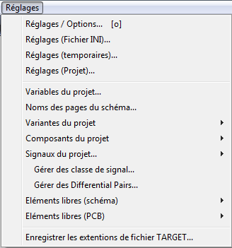 [[Image:MenuReglages.png|left]]<br>[[Réglages / Options]]<br>[[R%C3%A9glages_/_Options#R.C3.A9glages_.28Registry.29|Réglages (Registry)]]<br>[[R%C3%A9glages_/_Options#R.C3.A9glages_.28temporaires.29|Réglages (temporaires)]]<br>[[R%C3%A9glages_/_Options#R.C3.A9glages_.28Projet.29|Réglages (Projet)]]<br>[[Variables du projet]]<br>[[Page|Pages du schéma]]<br>[[Variantes|Variantes du projet]]<br>[[Composants du projet]]<br><br>[[Signaux du projet]]<br>[[Classes de signal |Gérer des classes de signal]]<br>[[Differential Pairs|Gérer des Differential Pairs]]<br>[[Eléments disponibles (schéma)]]<br>[[Eléments disponibles (PCB)]]<br>[[Enregistrer les extensions de fichiers TARGET 3001!]]<br>